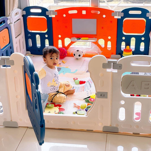 14 Panel Non-assembly Foldable Baby Play Yard With Mat & Football Playpen with Safety Locking Door For Baby to 5 Years (59'' x 59'', Blue)
